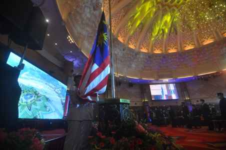 Acara menaikkan Jalur Gemilang disempurnakan oleh anggota Tentera Laut Diraja Malaysia (TLDM), diikuti bacaan ikrar yang dipimpin oleh 11 orang wakil petugas barisan hadapan.