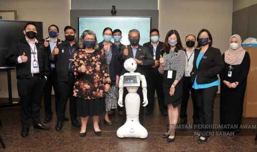 Terdahulu, YBhg. Datuk turut berkesempatan menyaksikan demostrasi robot baharu yang bakal dikendalikan oleh Bahagian Kerajaan Digital. Hadir sama, Puan Josie Lai, Timbalan Ketua Pengarah (Pembangunan) dan Puan Doria Tai, Pengarah Bahagian Kerajaan Digital.