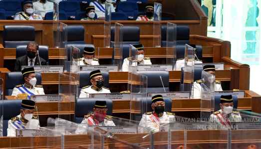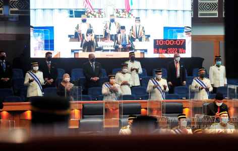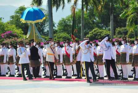 Seterusnya Tuan Yang Terutama Tun Datuk Seri Panglima Juhar menerima tabik hormat dan memeriksa Barisan Kehormatan dari Batalion Ketiga Rejimen Askar Melayu Diraja sebelum berjalan masuk ke Dewan Persidangan.