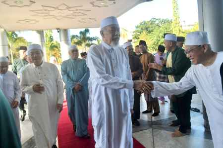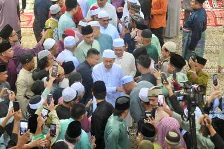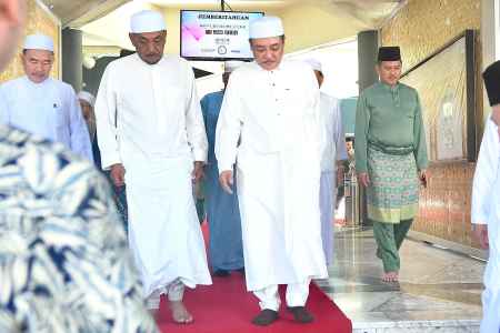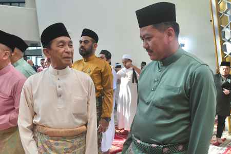 10 APR - Tuan Yang Terutama Tun Datuk Seri Panglima Haji Juhar Bin Haji Mahiruddin dan isteri, Yang Amat Berbahagia Toh Puan Datin Seri Panglima Hajah Norlidah Binti Datuk R.M. Jasni menunaikan solat sunat Aidilfitri bersama lebih 3,500 jemaah di Masjid Negeri di sini pagi tadi.
